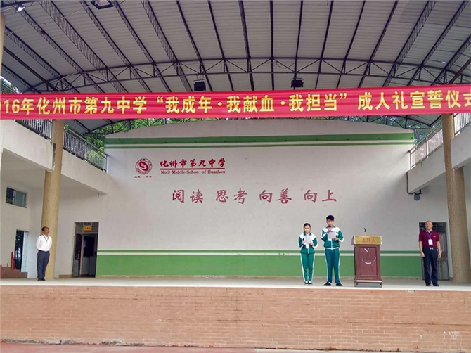 化九中在这次献血活动中,领导非常重视,团委何冠华书记具体组织无偿献血工作,该校在献血当天举行了“我成年,我献血,我担当”的成人礼宣誓仪式,郭华波副校长在仪式上作了动员,号召同学们要做敢于担当的一代青年,积极加入到无偿献血队伍中来。升旗完毕,同学们在国旗下庄严宣誓,要用实际行动,做个有作为有担当的中学生。
