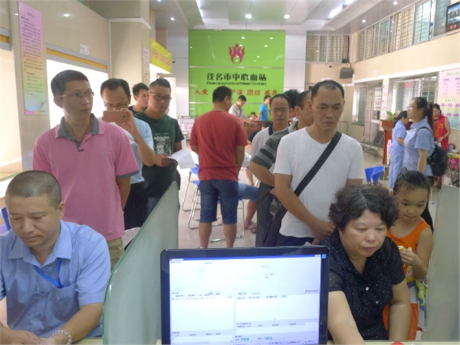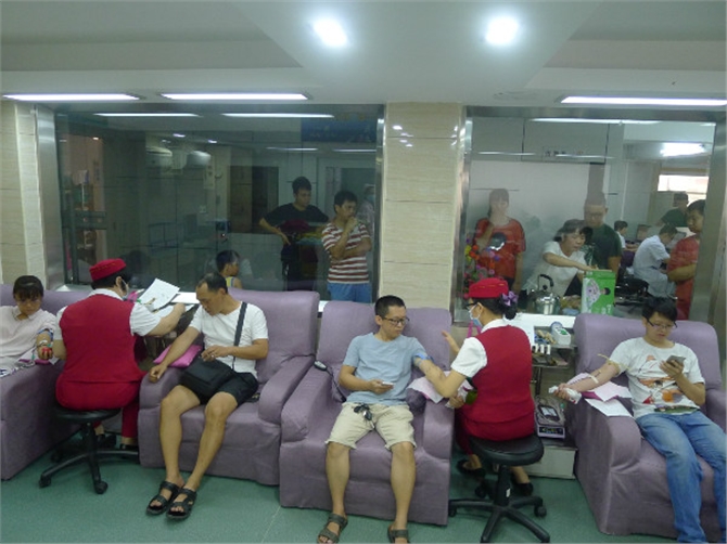 早上8时,血站采血大厅的大门刚打开,广东众和化塑的员工们就一涌而入,有条不紊地开始填表和排队体检,初筛合格后有序地喝水、吃点心,在采血室外排队等候献血。