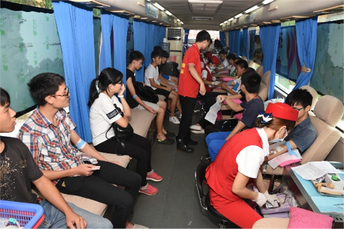 24日下午15时50分,“天鸽”刚过,天气见晴,三辆大型采血车提早到达高州二中校园内,早已等候的学生志愿者协助血站的医护人员摆放体检用的台椅,并准备好鸡蛋糖水。对这次献血活动该校领导十分重视,派出30名学生志愿者做好献血后勤服务工作。每辆车的门口都有4名学生志愿者负责指引献血的师生上下车,并把献完血的师生引导到休息区休息。为了让献血者有个舒适的休息环境,学校还开放了有冷气的会议厅,让献血者得到充分的休息。