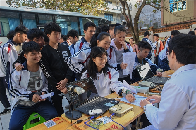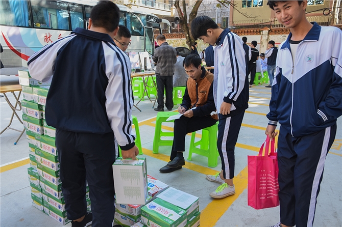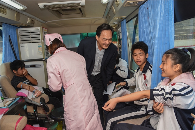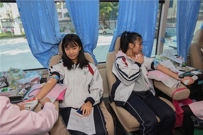 12月5日,电白四中师生们秉承传统遗风,开展无偿献血活动。活动现场,蔡副校长与各班主任协助血站人员指导献血者填写献血登记表、测量血压、抽血化验。大部分同学刚满十八周岁,第一次参加无偿献血,心理有点忐忑,老师又上车为他们鼓励打气。