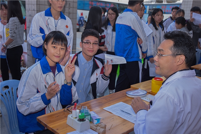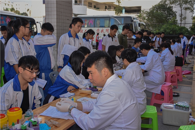 12月8日下午,化州市第二中学师生在教学楼前,开展了较大规模的无偿献血活动,共有500多人参加了献血的筛选,最后合格并献血的共有442人,献血量为8.84万毫升,创下近年无偿献血该校人数及血量的新高。