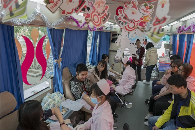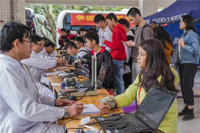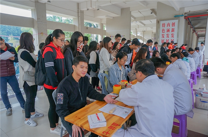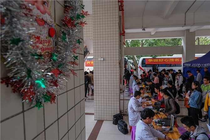 2017年12月23日上午,广东石油化工学院在官渡校区二教A楼下开展了本学期最后一次无偿献血活动。在茂名市中心血站和青年志愿者协会的组织下,本次无偿献血活动共有358名师生献出热血,献血量92900毫升。