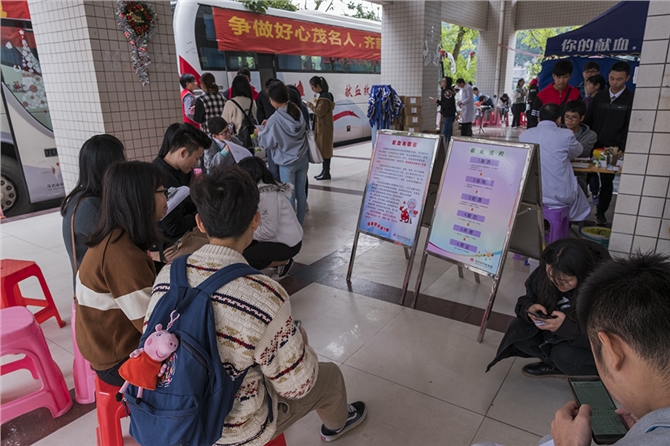上午8时许,茂名市中心血站献血车驶入广东石油化工学院官渡校区,经过青协干部和血站医护人员的努力,现场很快准备就绪。同学们纷纷在填表区井然有序地排起了长队,献血热情高昂踊跃。