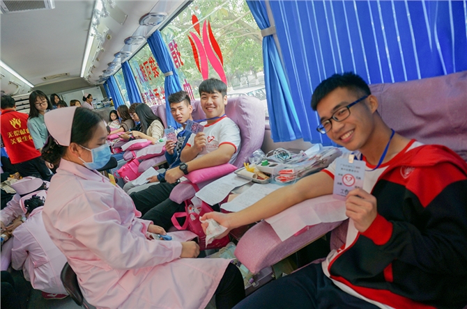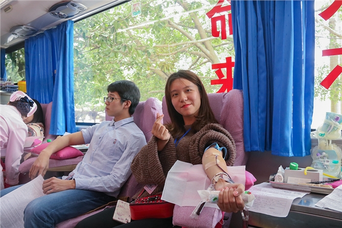 献血车内的气氛是十分轻松愉快的,送一片勇气的执著,留一串芳香的祝福。志愿者、医护人员和献血者们有说有笑,欢声笑语冲淡了同学们在采血过程中不可避免的紧张心理。值得一提的是,本次活动更是一场以学生干部率先垂范带头的无偿献血活动,期间共有70多名青协干部献出爱心。他们既是志愿者,也是本次活动的最后一批献血者。在不影响工作的前提下,他们用自己的行动宣扬了甘于奉献、关爱生命的美好品质。