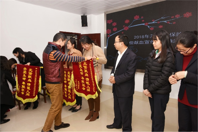 李华秘书长和梁芬副站长向受表彰的单位授予爱心锦旗,感谢他们一直以来对无偿献血公益事业的大力支持。近年来,茂名市保险行业协会积极支持无偿献血,每年定期组织保险公司员工参加爱心献血活动。2017年7月18日茂名市保险行业协会联合茂名市中心血站举办 “血同脉,爱同行” 为主题的献血活动,该活动有89名保险从业人员献血。据统计,全年共有160名保险从业人员参加无偿献血,累计献血量3.82万毫升。