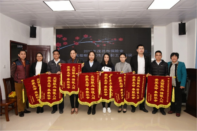 2018年1月16日,茂名市保险行业协会联合茂名市中心血站在本部举行献血宣传及表彰会议,表彰保险协会辖下的中国平安财产保险股份有限公司茂名中心支公司等17家保险公司。保险行业协会李华秘书长及市中心血站梁芬副站长出席会议,参会人员还有38家保险公司的负责人。茂名市保险行业协会秘书长李华在会上高度赞扬了茂名保险人具有“人道、博爱、救死扶伤的传统美德”,鼓励他们要继续支持无偿献血,用无私奉献的行动传播精神文明,传播华夏大爱,用博大情怀倡导助人为乐的社会新风尚!