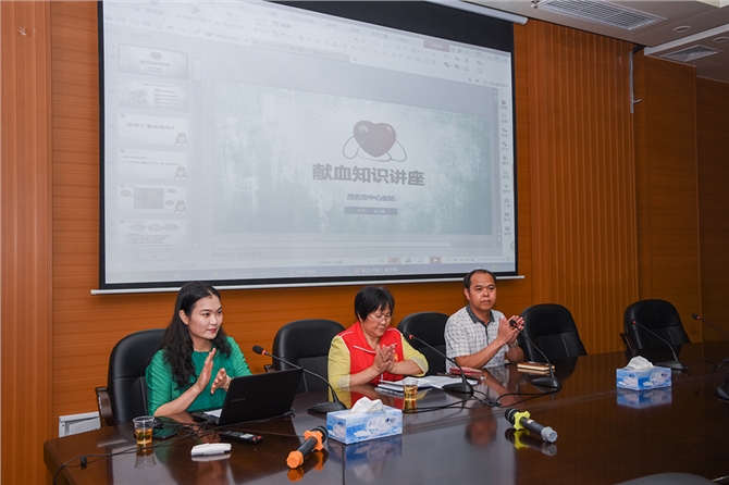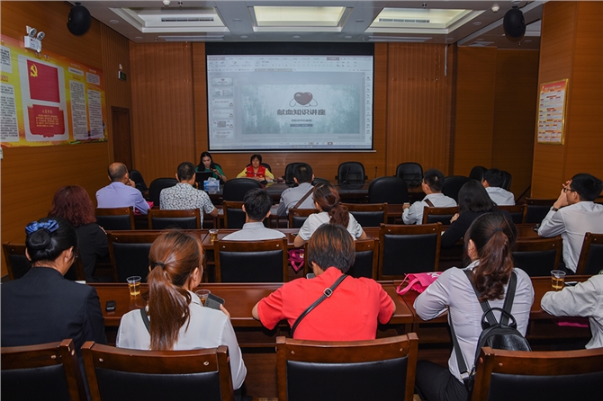 随后,与会同志在十楼会议室听取血站梁芬副站长关于近年来中心血站的采供血情况介绍和宣传科崔侨惠主任的《血液知识》讲座。他们还分享了粤西献血冠军、茂名市献血办李电才同志的快乐献血历程:累计献血次数超200次,献血总量近十万毫升。