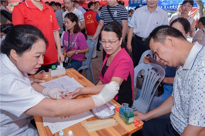 当天气温达35度,300多名党员干部顶烈日冒酷暑踊跃参加无偿献血。在献血过程中,党员干部积极带头,做好了表率。市卫计局黄立红局长带头献血,在黄局长的带领下,市卫计局副调研员黄绵及李英、张丹、张聘权、邱巧萍、宁凌峰、黄智等13名党员干部参加献血。市烟草局李金泉副局长带领8名党员干部参加献血。献血队伍中我们又见到熟悉的身影,市财政局献血“老司机”吴伟东,他已54次献血,献血总量达2.85万毫升,曾获得国家、省无偿献血奉献奖金奖。市直工委洪卡明科长第12次献血,累计献血量3000毫升。