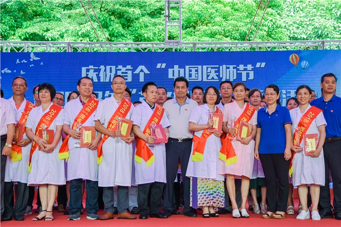 8月17日,茂名市庆祝首个“中国医师节”暨2018年“茂名好医生” 颁奖活动在茂名市文化广场图书馆南侧广场举行,市中心血站派出多名医务人员和献血车到现场助威。茂名市政府副秘书长李恒和与市卫生计生局黄立红局长等领导为获奖医师颁奖。
