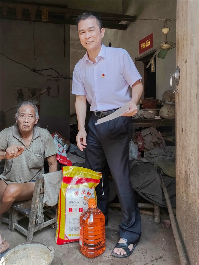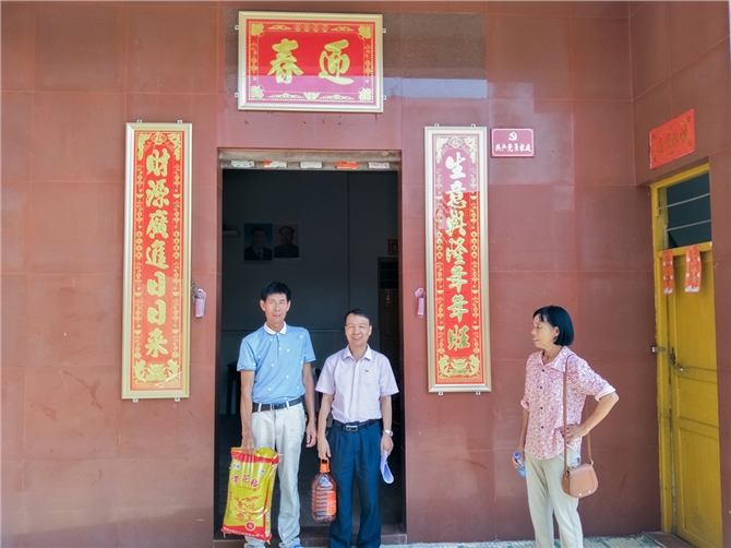 9月20日,茂名市中心血站党支部书记、站长何寿国在帮扶责任人陪同下,带着大米、花生油等生活用品深入扶贫点开展中秋前的扶贫慰问活动。