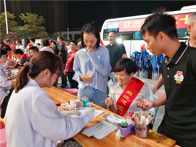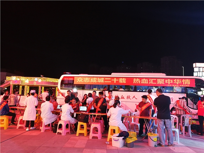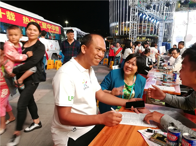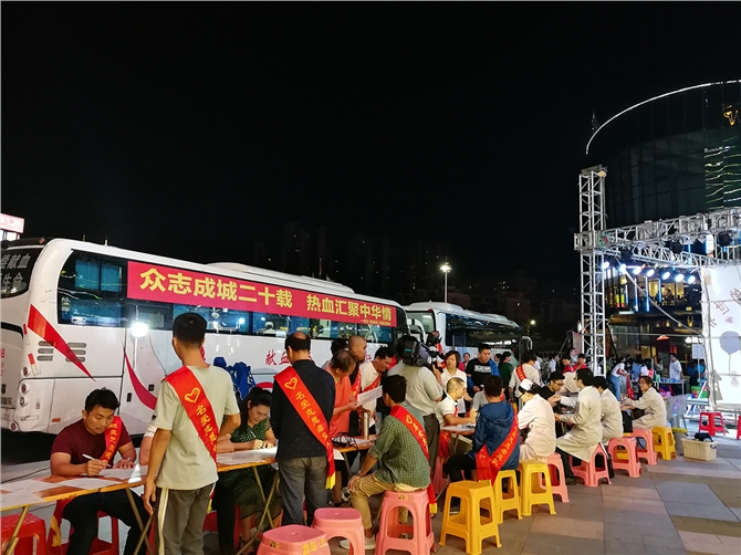 当天晚上7时,两辆采血车停在东汇城广场,不少爱心人士在有序地填表、体检、献血。而在另一侧,不少市民在名爱志愿者的引导下,就座在舞台下方,观看无偿献血公益晚会,舞蹈、歌唱、弹奏等精彩节目轮番登场,中间还穿插了献血用血有奖知识问答,现场高潮迭起,气氛热烈。粤西卓越LP8林晓作说:“通过联系市中心血站,得知我市血液供应一直都很紧张,因为临床急救用血还不能靠人工制造或是其它的物质所代替,只能通过健康适龄公民捐献,所以本次召集了近300名爱心人士,和我们一起进行这场大型的献血宣传活动。希望借助宣传带动作用,吸引更多社会爱心人士关注无偿献血公益事业,以实际行动捐献热血点亮生命。”
