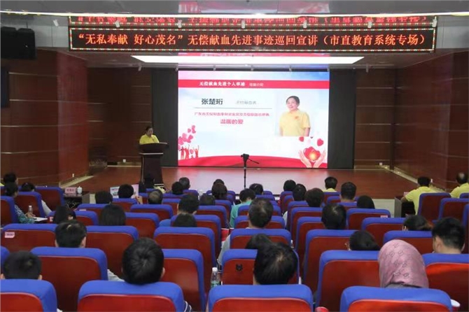 为了做好无偿献血宣传工作,进一步贯彻落实《献血法》和《广东省实施〈中华人民共和国献血法〉办法》,11月9日下午,“无私奉献 好心茂名”无偿献血先进事迹巡回宣讲市直教育系统专场活动在市教育局举行,来自市教育局、市卫生计生局有关领导和市直教育系统的近200名教职工到场聆听。