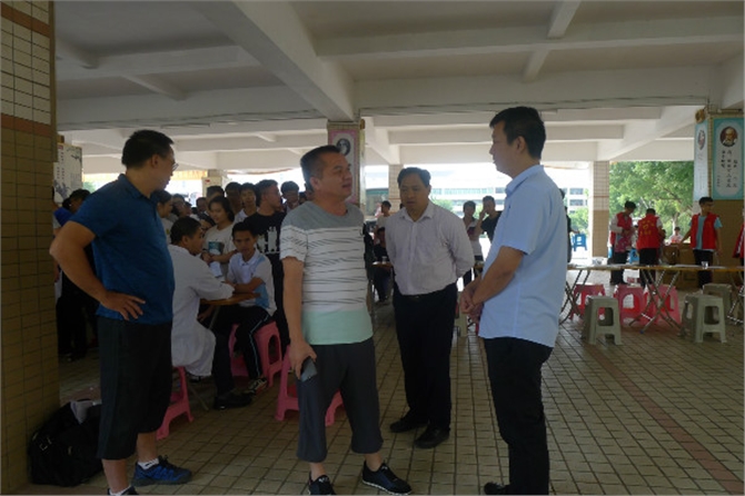 8点30分,参加无偿献血的同学陆续来到献血活动现场。整个校园都被一股爱心的暖流所包围,同学们有序地进行体检、验血,献血等流程,校方志愿者在小黑板写上了献血的注意事项和献血流程,并不停地穿梭在献血人群中,暖心地为献血的同学提供献血指引。信宜中学钟校长和梁副校长也来到献血现场指导工作,为同学们加油打气。信宜中学曹主任是这次献血活动的组织者,一直坚守活动现场进行各方面的协调和沟通。