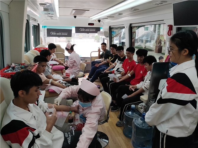8时未到,李耀富校长、黎庆东副校长带领化三中学生会的学生干部和校义工协会的会员早早就到达现场,配合化州市义工协会的6名队员开展献血前的准备工作。他们分工合作,帮助血站的工作人员摆台凳、装纪念品、准备糖水、剥鸡蛋壳,有条不紊。8时30分,第一节课下课,高二、高三符合献血条件的同学们就蜂涌而至,献血现场瞬间就热闹起来,学生们拿着事先填写好的献血登记表,排着长队进行体检和血液初筛,初筛合格的学生们带着登记表兴高采烈地吃着鸡蛋和红枣、红糖水,吃完后排着长队一个一个登上献血车献血。
