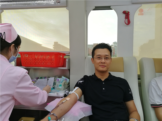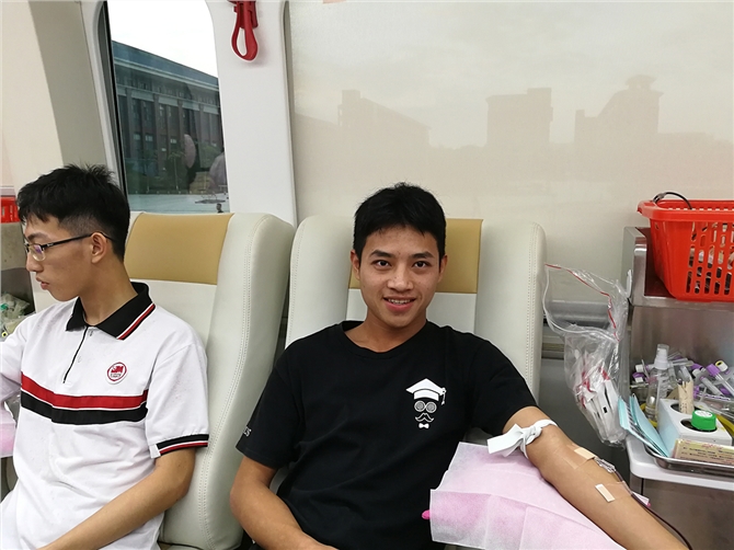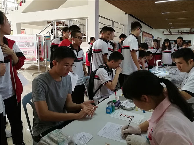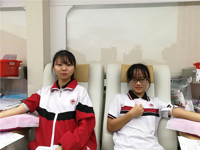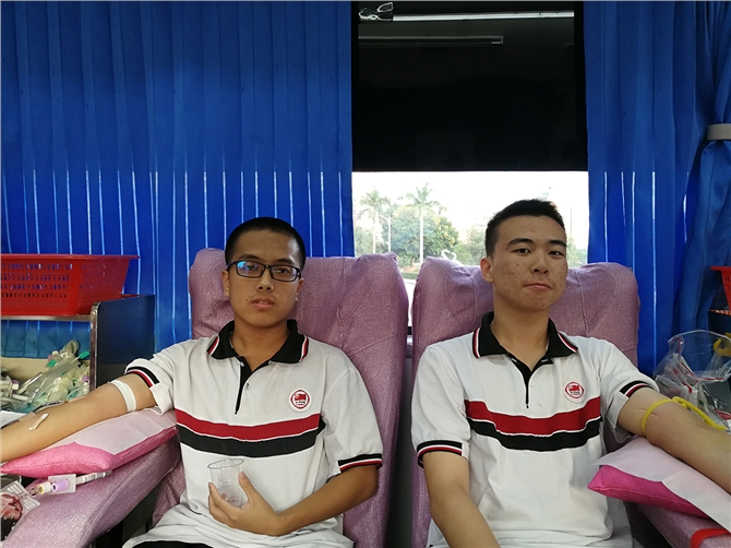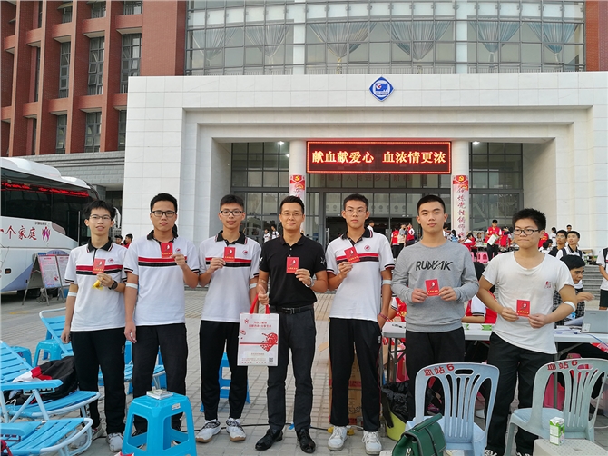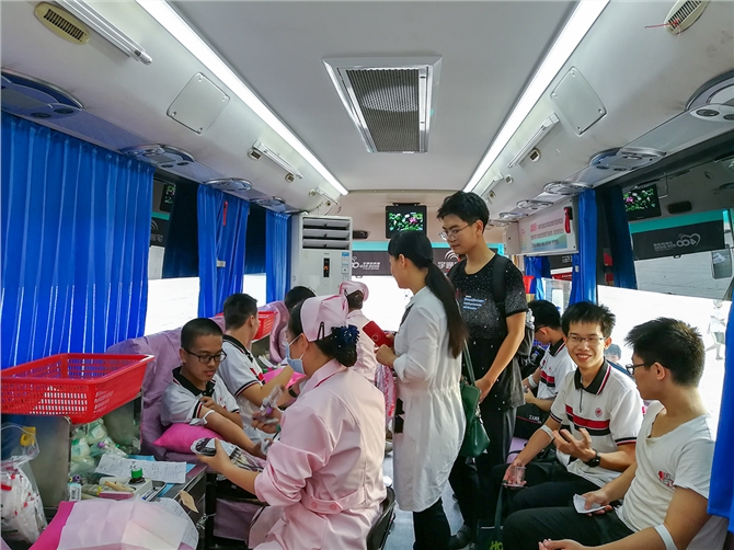 活动当天,洪喜亮校长、吴春明主任到现场指导工作,关心和鼓励献血的师生。献血现场热闹非凡,在血站的工作人员的协调下,学生志愿者团队在填表、体检、糖水区等区域热情地服务师生,献血的师生在体检合格后愉快地走上了献血车。袁洪老师率先走上了献血车,多年来他一直支持无偿献血,累计献血3次,捐献热血1200毫升。献血车上充满了欢声笑语,有的同学在向医务人员咨询献血知识;有的同学互相加油打气;有的在交流校园生活点滴;有的在分享学习心得等。参加献血的同学说:“这次献血不但帮助了他人,也是高考的一针强心剂,觉得自己有了更大的勇气和信心。”在领证区,很多师生在合照留念,记录这珍贵的瞬间。