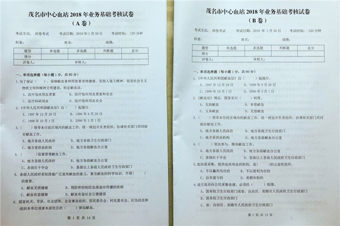 为加强员工法律意识和质量意识,进一步提高员工业务理论水平和综合素质,增强采供血队伍服务能力,茂名市中心血站加大力度抓好职工业务培训和考核工作。1月30日,在九楼会议室组织开展了采供血相关法律法规闭卷考试。考试涵盖范围包括《中华人民共和国献血法》、《广东省实施中华人民共和国〈献血法〉办法》、《血站管理办法》、《血站质量管理规范》、《血站实验室质量管理规范》等相关法律法规。全站干部职工98人参加了此次考核,旨在通过业务考试和考试结果的运行,在全站职工中形成重视学习,坚持学习的浓厚氛围,进一步增强在实际工作中熟练地运用采供血业务知识的能力,从而为广大无偿献血者提供更优质、规范、安全的献血服务。