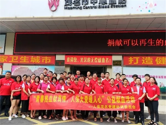 2019年7月20日上午,茂名人保党建协调委员会联合茂名市中心血站举办了“青春热血献真情,人保大爱暖人心”的人保专场献血活动,共同掀起了一场无偿献血的爱心热潮。