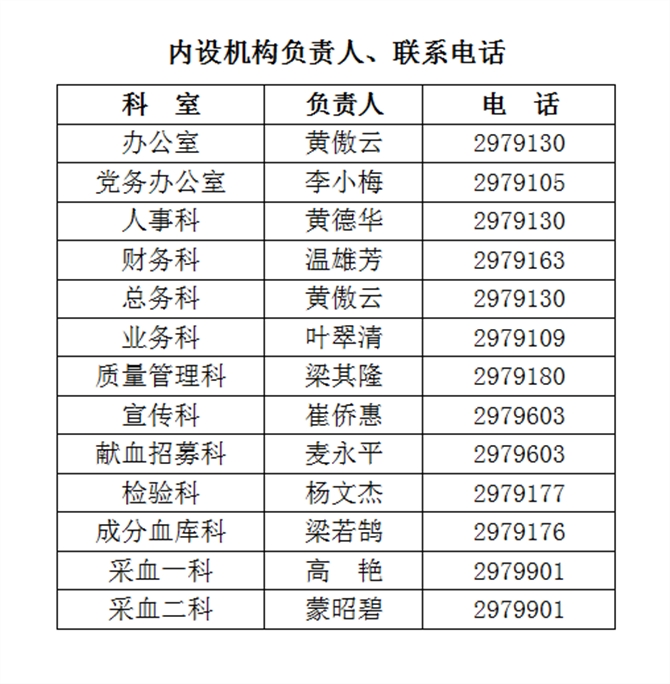 茂名市中心血站共设置13个科室,分别是办公室、党务办公室、人事科、财务科、总务科、业务科、质量管理科、宣传科八个职能科室和献血招募科、检验科、成分血库科、采血一科、采血二科五个业务科室,各个科室分别行使不同的职责。