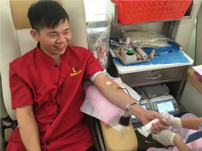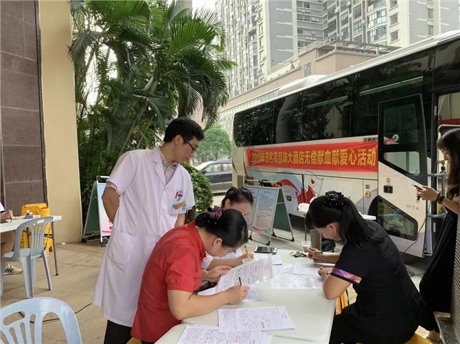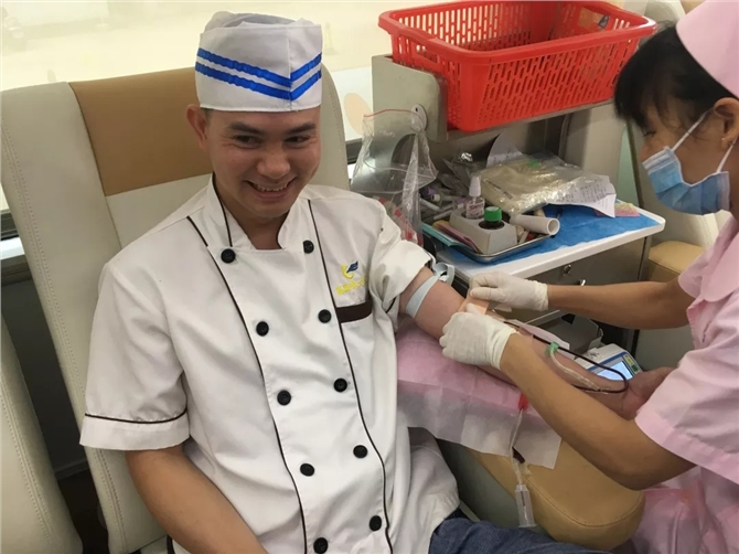 献血活动现场,爱意涌动,血浓情浓,血站工作人员认真引导酒店的员工们按序进行登记、体检,血液初筛,合格后进行献血血。此次活动意义非凡。杨俊典先生累计献血十二次,他说:“无偿献血是利人利己的行为,不但能促进自身的造血功能,而且能帮助到有需要的病人”。