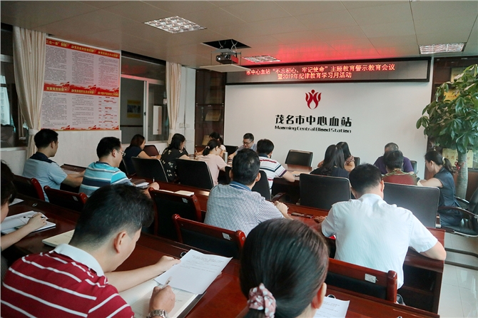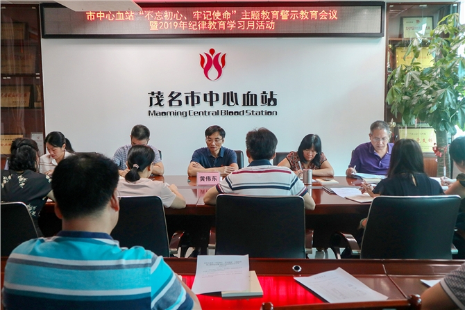 2019年10月16日上午,茂名市中心血站“不忘初心、牢记使命”主题教育警示教育会议暨2019年纪律教育学习月活动在五楼会议室举行,血站全体党员及中层干部参加,市中心血站党支部书记、站长何寿国作讲话,市卫生健康局党组成员、副局长、第一指导组组长黄伟东出席会议并讲专题党课。会议由党支部副书记李东明主持。