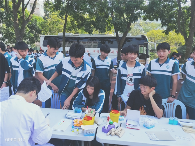 11月15日,在张良超校长的领导下,在团委书记何冠华的积极带领下,在挂级行政曹志雄、李东海,级长李水运、陈仕栋的认真组织以及年级班主任的大力鼓励引导下,全校师生积极参与到以“不忘初心、献我热血、救我同胞”为主题的无偿献血活动中来,共有175人次成功献血,创了该校献血以来的人数和血量的新高。献血的人员中,包括学生170人、教师5人(刘凤英、彭凤、李倩丽、陈胜程、何冠华等),何冠华书记是第五次参加无偿献血。李水运、陈仕栋、黄兴生、邹国泰、陈婷、邱纯等多名教师到献血现场进行志愿服务。特别是李华日主任,董仕宝、梁焕新老师当天牺牲午休时间为献血者蒸煮好鸡蛋红糖水。化州市义工团劳承艺秘书长带领15个志愿者早早就到达现场帮忙。在大家的共同努力下,化九中的献血人数和献血量创了该校献血纪录的历史新高,共有175人次,献血量3.53万毫升,为保障茂名市人民的健康不遗余力,给该校全体师生点赞。(图文:林冰)