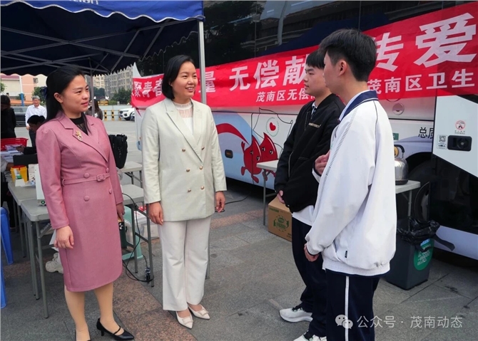 12月29日,茂南区副区长梁梨宁,茂南区政协副主席、区卫健局局长周丽梅到现场了解献血情况,指导无偿献血宣传发动工作,为现场献血者加油鼓劲