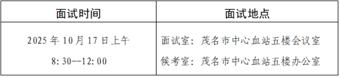 (五)如因工作原因等因素影响,导致本次面试时间调整的,将综合考虑各种因素做出合理安排,并及时在茂名市中心血站微信公众号发布公告,请应聘人员保持关注,及时应对。