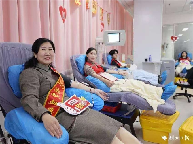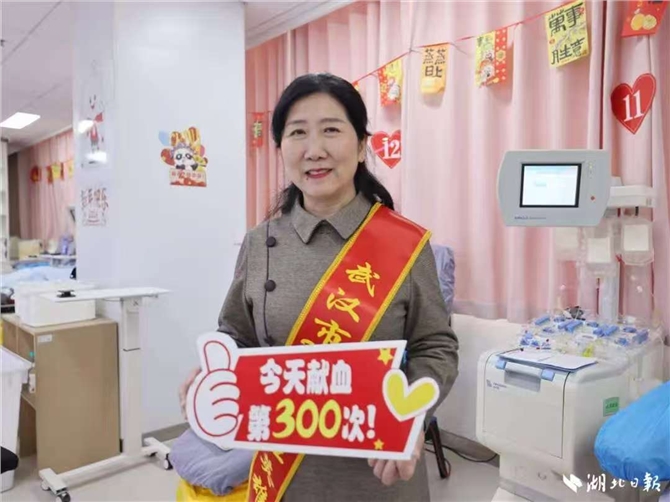 12月30日上午,武汉血液中心江南分中心,武汉大学历史学院教授、博士生导师潘迎春静静地躺在献血椅上,神情舒展,面带微笑。鲜红的血液从她的左臂缓缓流出——这是她21年来的第300次无偿献血。